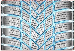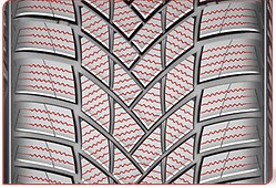 - Struktura bieżnika w kształcie litery V z otwartymi rowkami tworzy kanaliki wodne i poprawia skuteczność w zapobieganiu aquaplaningowi i slushplaningowi. Pomaga to utrzymać stały kontakt z nawierzchnią na mokrych i pokrytych błotem pośniegowym nawierzchniach.