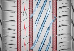 Pewna jazda i bezpieczeństwo w deszczowe dni. Nowatorska Technologia Skóry Rekina (Shark Skin Technology) i szerokie nacięcia szybko odprowadzają wodę spod czoła opony. Zmniejsza to ryzyko powstania zjawiska aquaplaningu. W szybkim osuszaniu powierzchni bieżnika pomagają specjalne lamele Aqua-Twist. Zwiększyło to przyczepność opony z mokrą nawierzchnią.